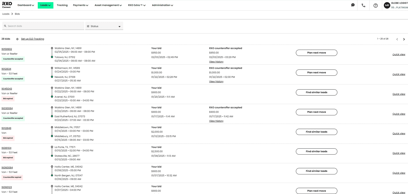 - Bids Page: Take advantage of both ‘Bid’ and ‘Buy’ options for loads, giving you the flexibility to negotiate or secure freight immediately.