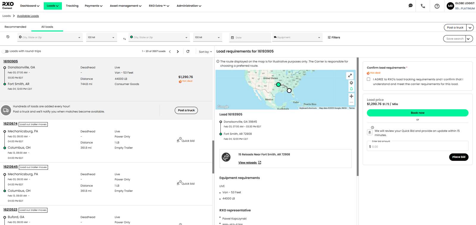 Finding the loads you want where you want them is simple on RXO Connect. It all starts with searching and filtering for the right loads – Narrow your search to a specific origin, destination, trip length, rate per mile, equipment, weight, and more!