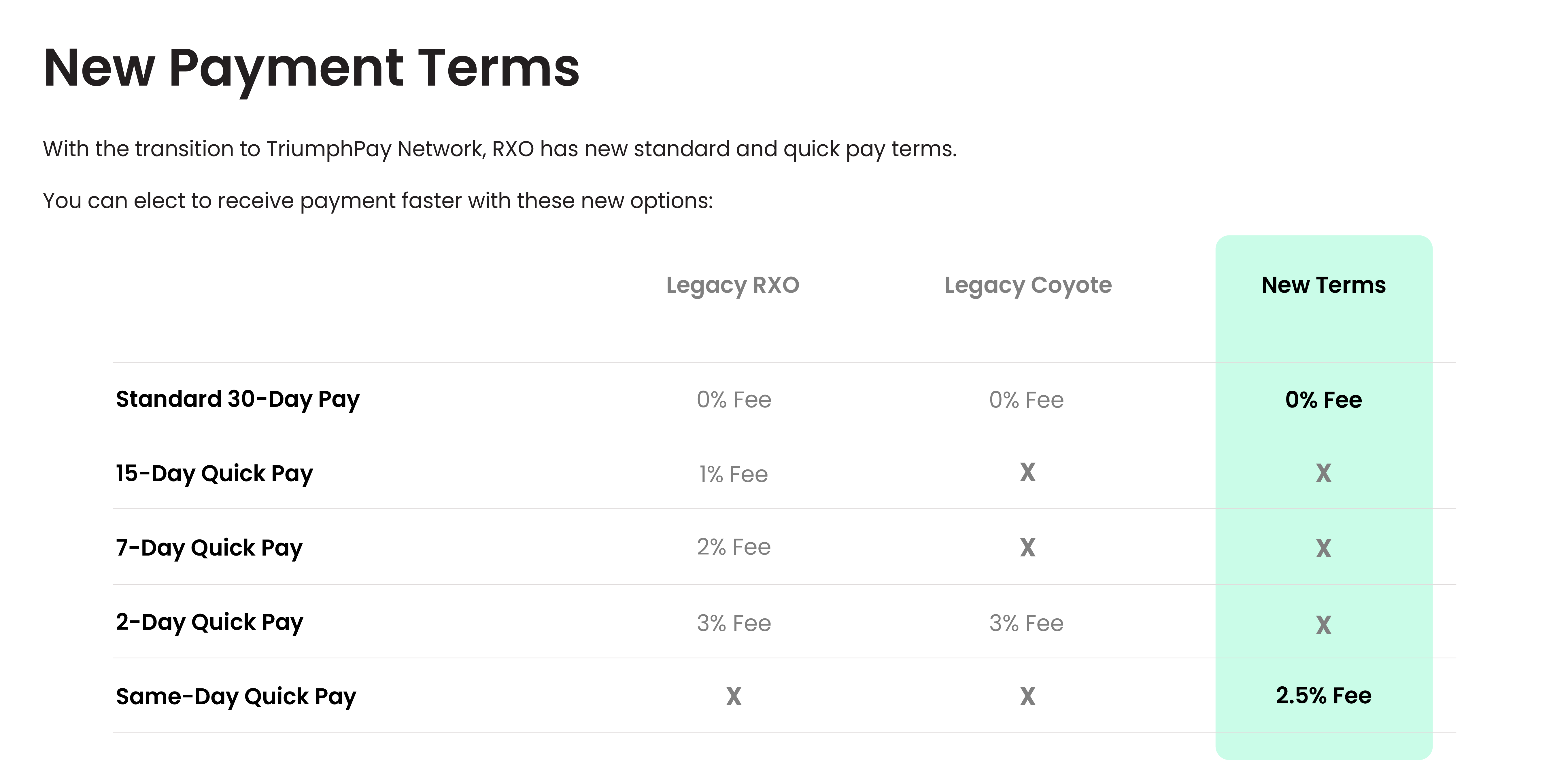 For users with RXO or legacy Coyote Quick Pay payment terms: