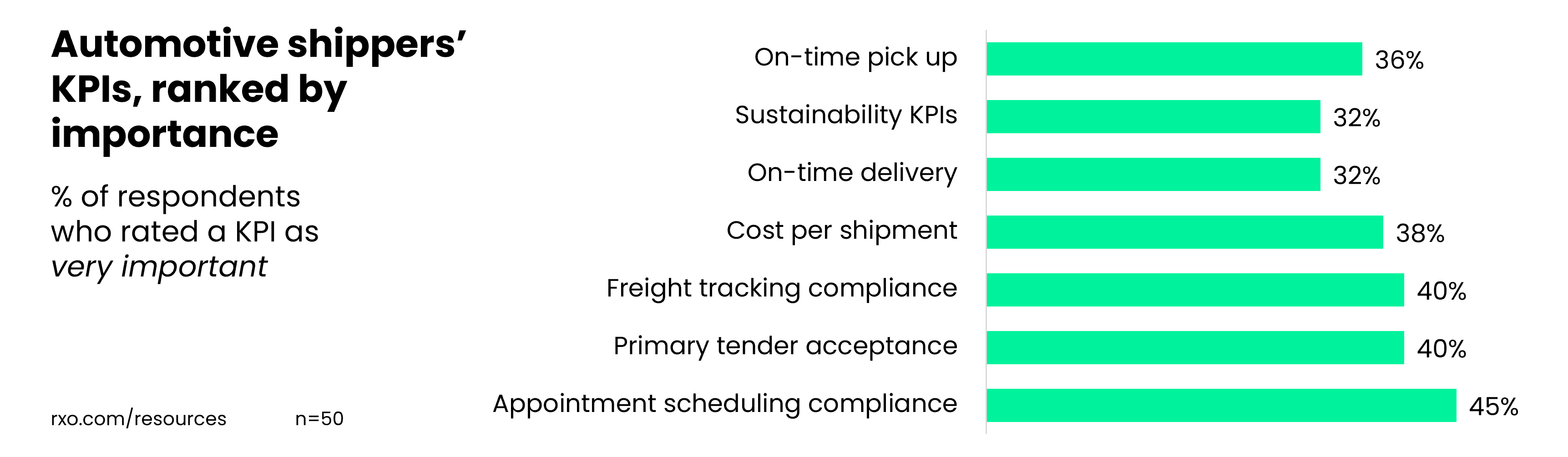 All KPIs are important — the K stands for “key” after all — but when asked to rate every core transportation metric by level of importance, appointment scheduling compliance stood above the rest, with 45% of automotive shippers saying it was very important.
