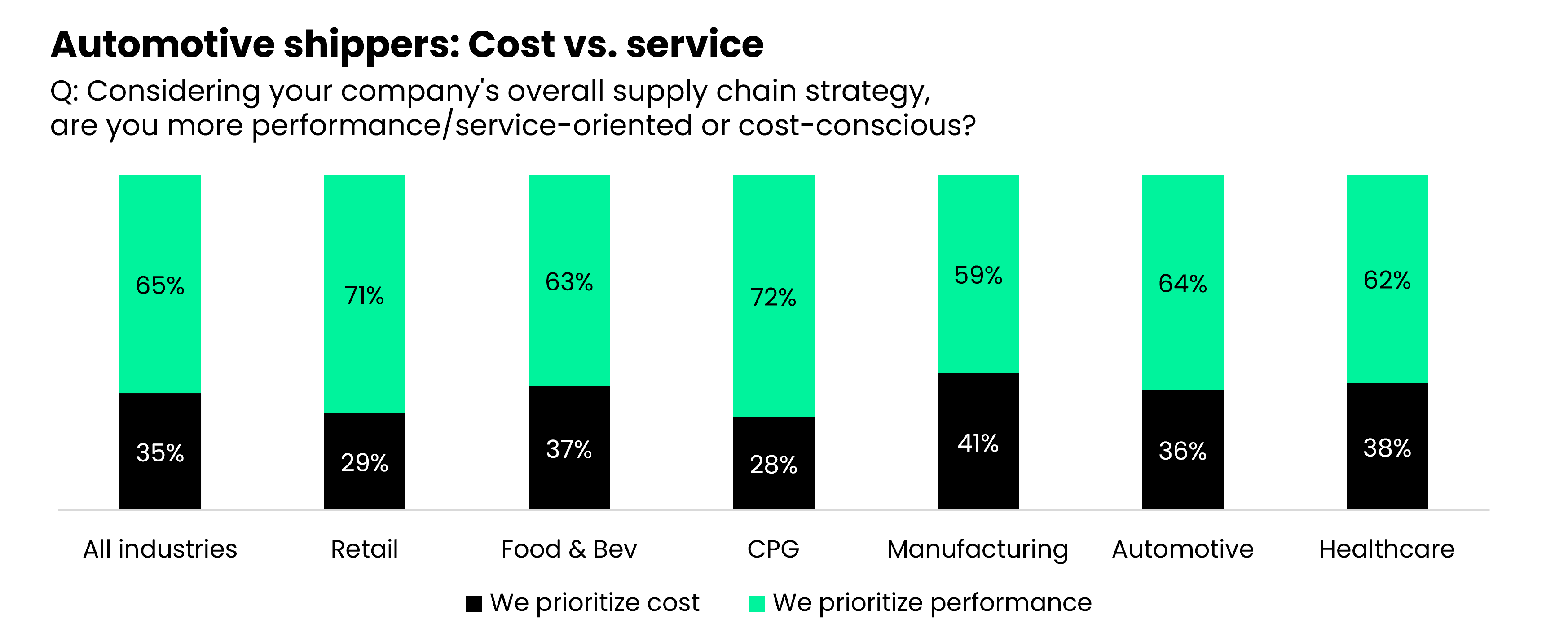 For automotive shippers, 64% said their organization prioritizes performance and service over cost.