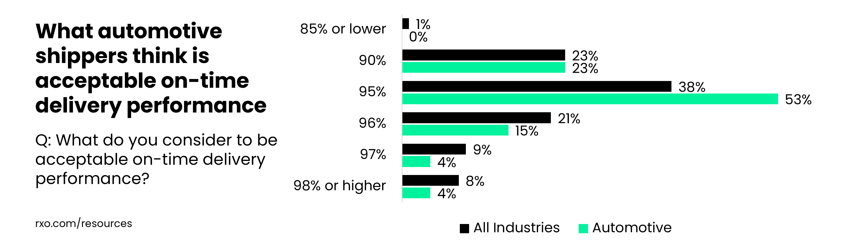 We asked automotive shippers what they consider to be acceptable on-time delivery performance from their carriers. Here’s what they had to say, and how it compares to average across all industries in the study.