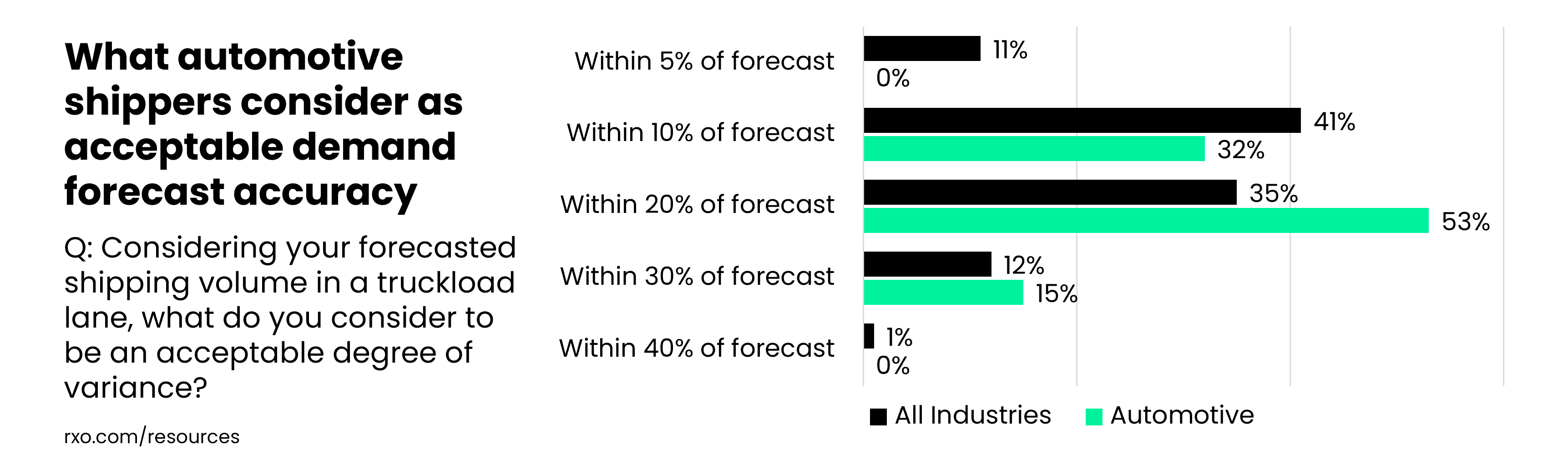 We asked automotive shippers what they consider to be an acceptable level of variance from their shipment forecast (in terms of load volume). Here’s what they had to say, and how it compares to average across all industries in the study.