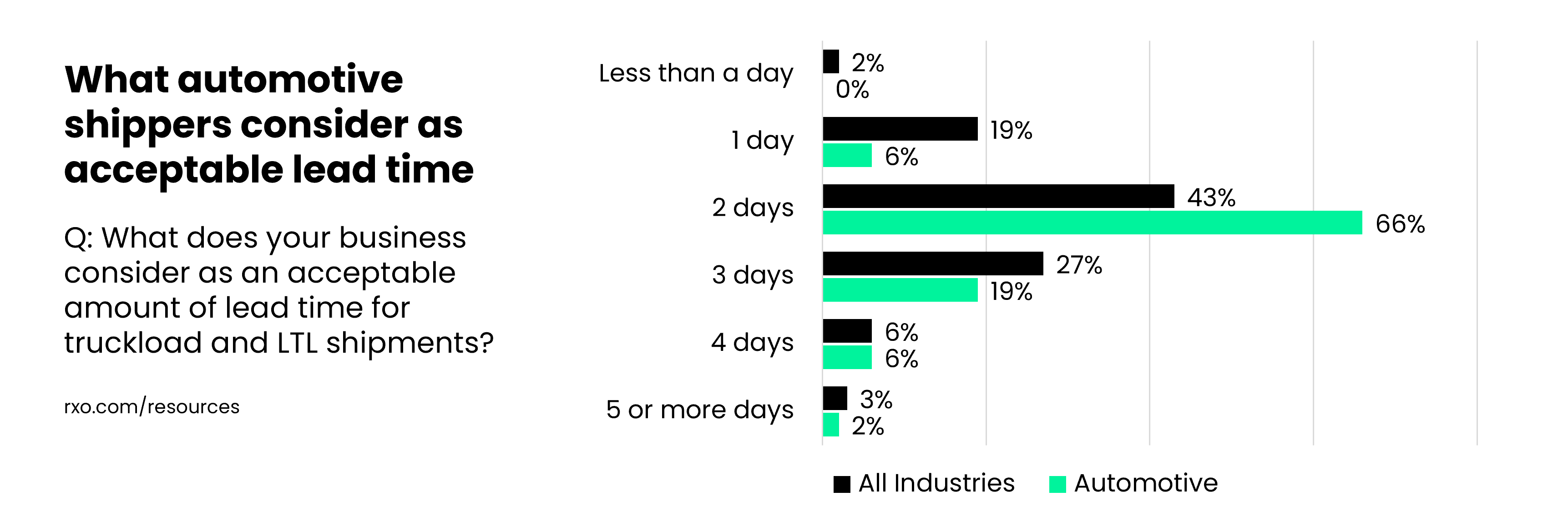 We asked automotive shippers how much lead time they think they should give to their carriers for truckload and LTL shipments. Here’s what they had to say, and how it compares to average across all industries in the study.