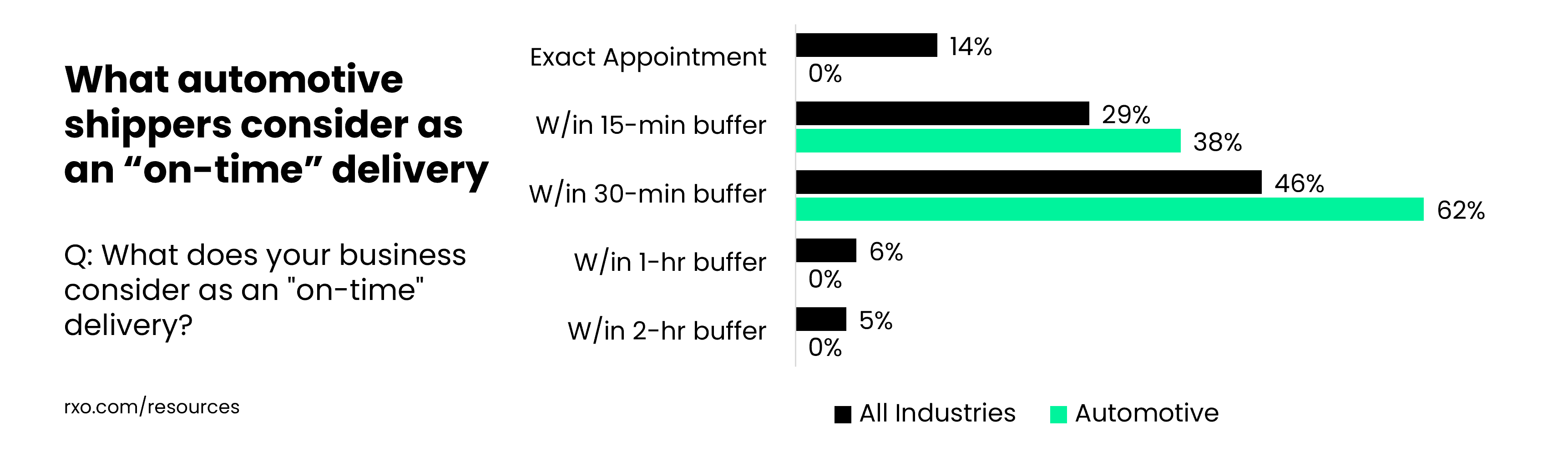 - Automotive shippers’ standard: On-time to an appointment with a 30-minute buffer