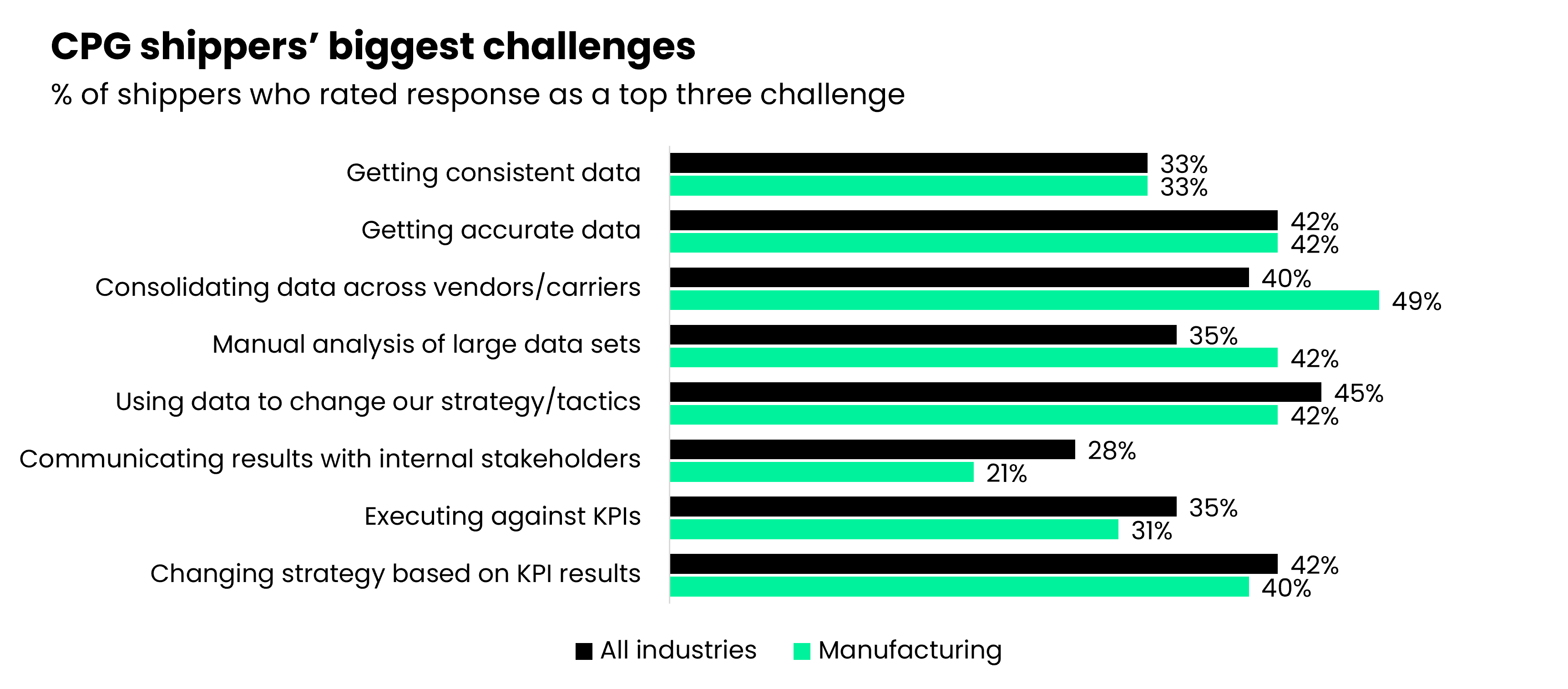 Finally, 79% of CPG shippers believe turning KPI data into actionable insights is challenging and time consuming, which was tied for second across all industries.