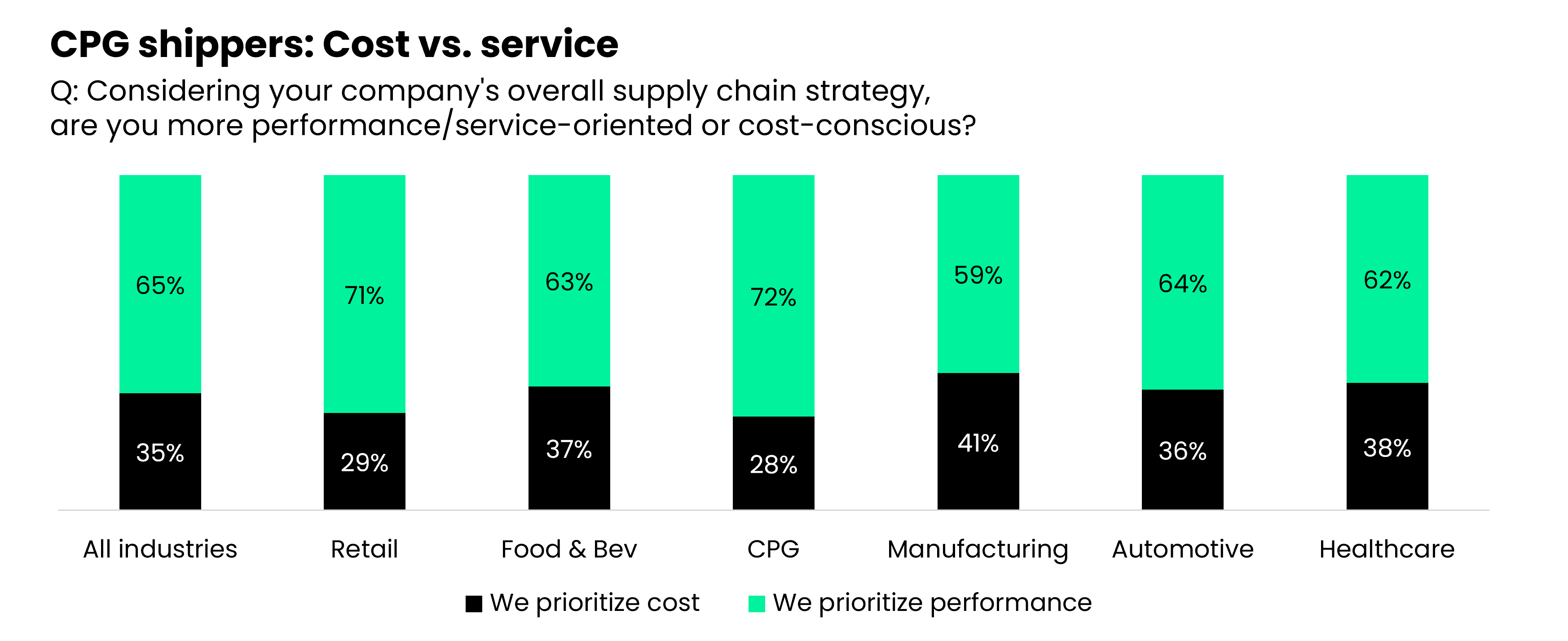 For CPG shippers, it was service, with 72% of respondents saying they prioritize performance over cost, which was 7% above the average and the highest out of any industry.