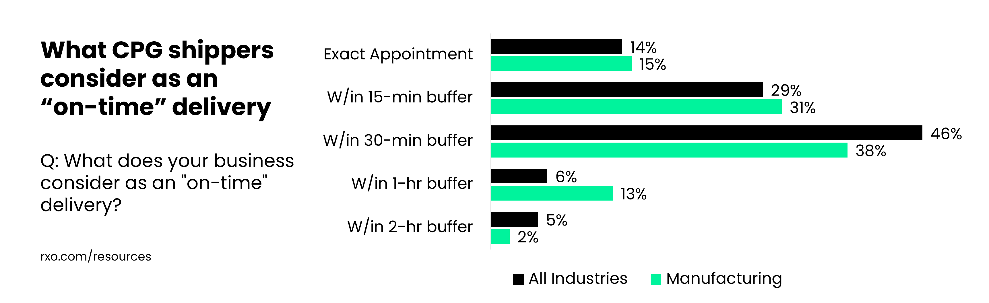 - CPG shippers’ standard: On-time to an appointment with a 30-minute buffer