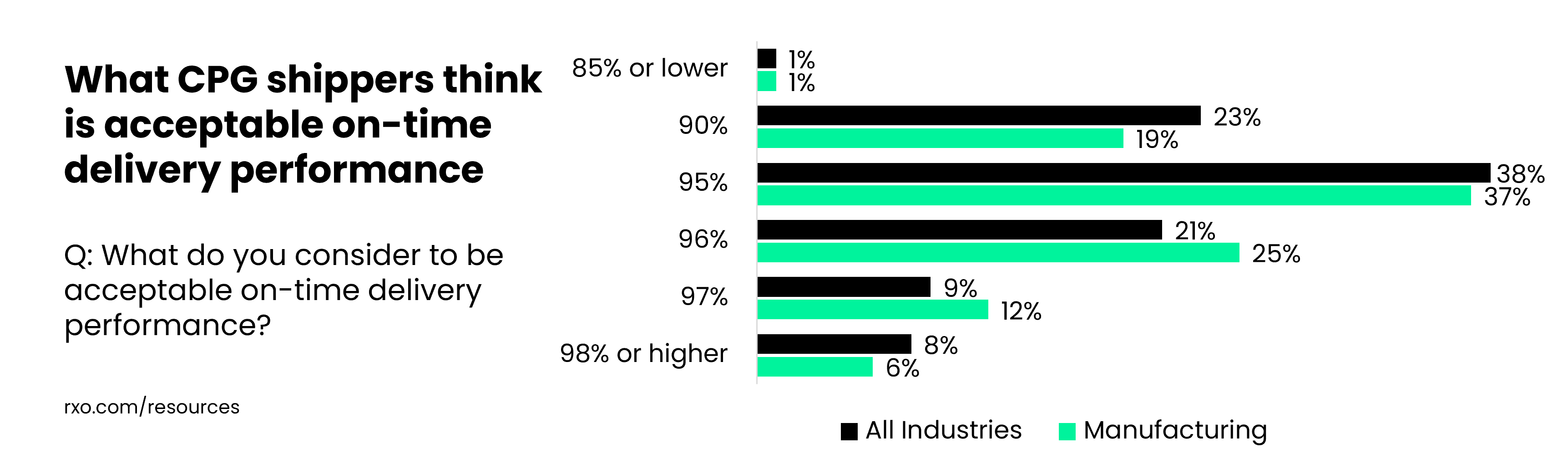 We asked CPG shippers what they consider to be acceptable on-time delivery performance from their carriers. Here’s what they had to say, and how it compares to average across all industries in the study.