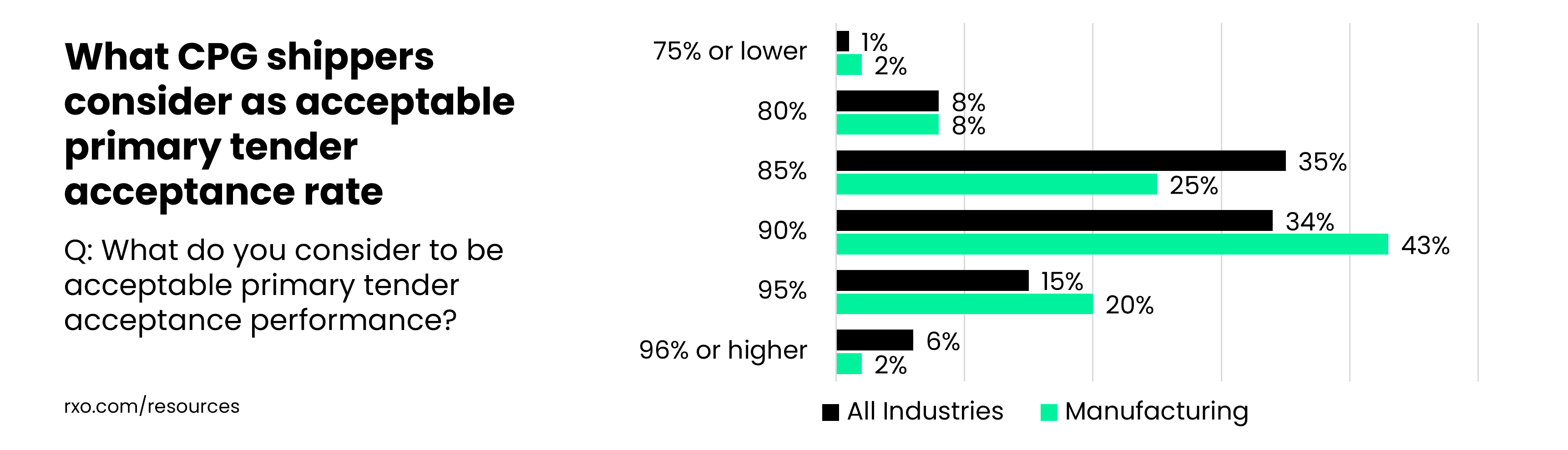 We asked CPG shippers what they consider to be a reasonable primary tender acceptance rate from their carriers. Here’s what they had to say, and how it compares to average across all industries in the study.