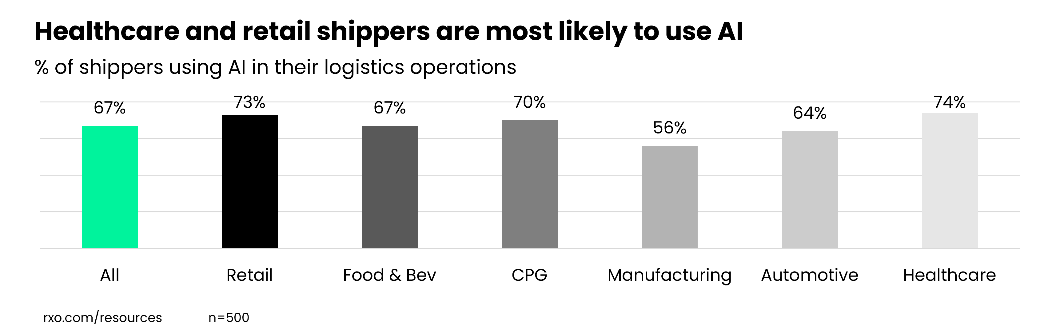 We asked respondents if they’re using AI in their logistics operations — healthcare shippers were the most likely say that they are (74%) and manufacturing was the least likely (56%).