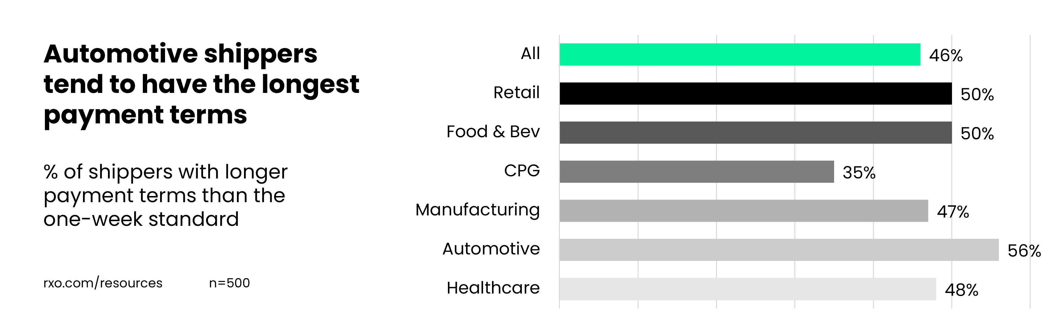 The quickest to pay was consumer packaged goods shippers, with only 35% of respondents above the standard.
