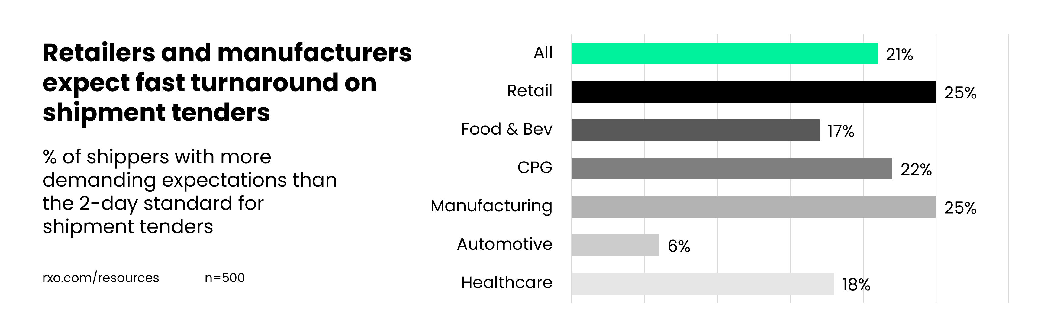 Breaking this down by industry, healthcare shippers had the highest percentage of respondents whose expectations exceeded the 95% standard (50%), followed by manufacturing (43%).
