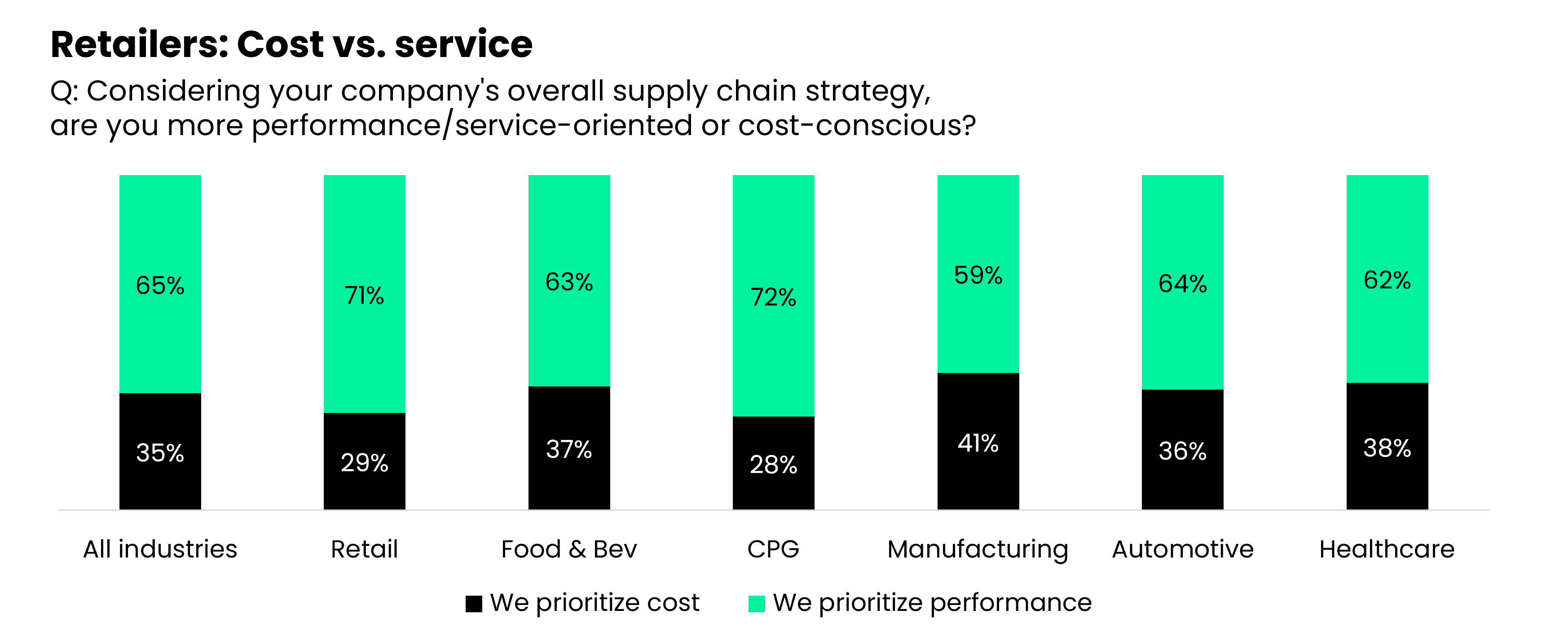 For retailers, it was service, with 71% of respondents saying they prioritize performance over cost. This was 6% higher than the average and lines up with their most important KPI answer (on-time pick up and delivery).