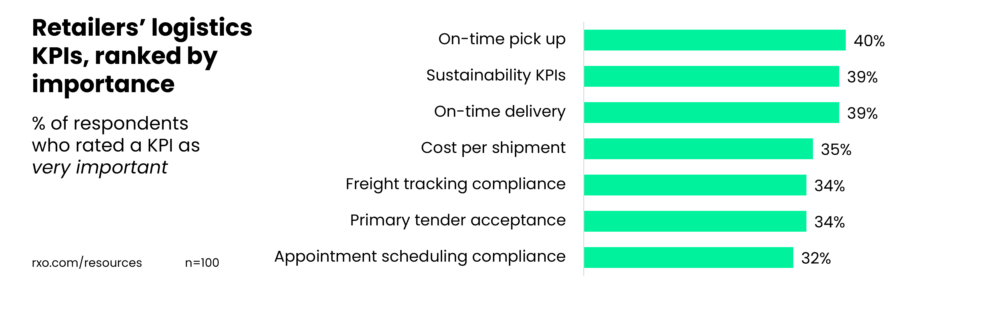 All KPIs are important — the K stands for “key” after all — but when asked to rate every core transportation metric on level of importance, on-time pick up and on-time delivery stood out, with 40% and 39% of retailers saying they were very important, respectively.