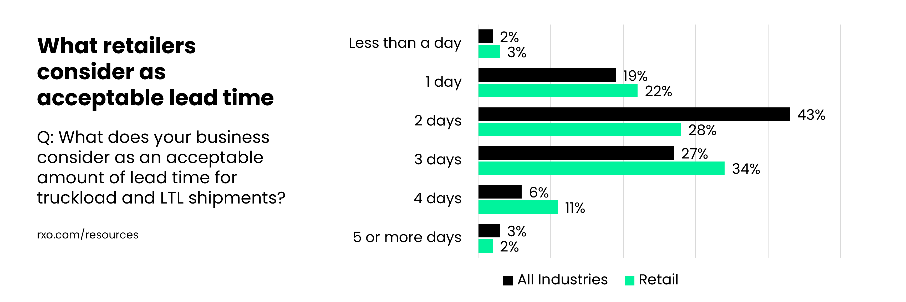 We asked retailers how much lead time they think they should give to their carriers for truckload and LTL shipments. Here’s what they had to say, and how it compares to average across all industries in the study.