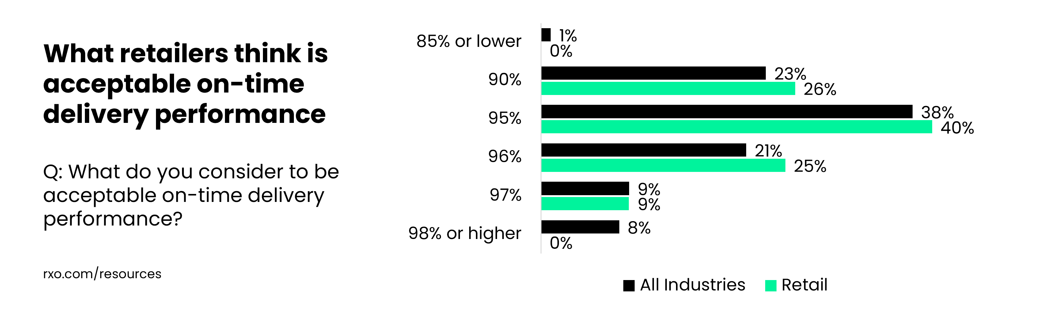 We asked retailers what they consider to be acceptable on-time delivery performance from their carriers. Here’s what they had to say, and how it compares to average across all industries in the study.